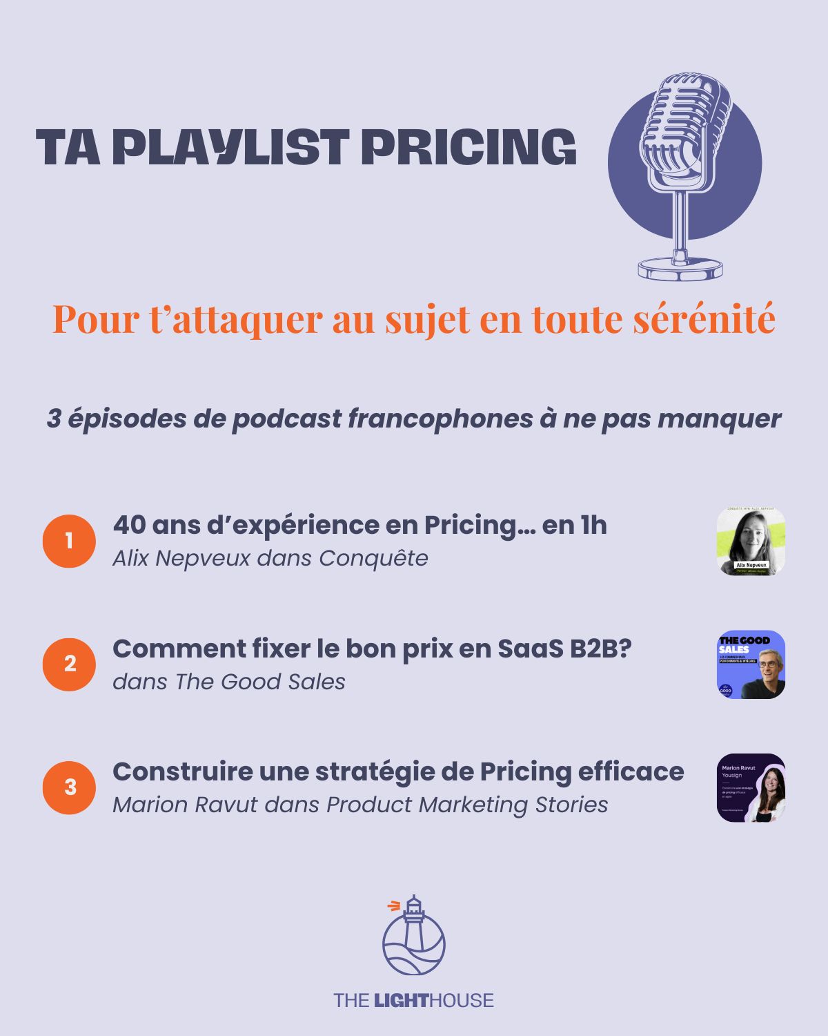 Tu veux (enfin) aimer parler de Pricing? Voici 3 podcasts pour t’y mettre. 🎧 Le pricing, c’est souvent un sujet qui intimide les PMM, mais pas que. Pour citer un collègue PMM: “mais sérieusement, comment tu peux aimer ce sujet?” 😅 Parce que c’est un sujet passionnant! Si, si… Et bien pensé, il peut générer une croissance incrémentale à 2 chiffres. Alors si tu veux t’attaquer au sujet, voici une sélection de 3 épisodes en français qu’avec The Lighthouse - Pricing & Packaging d'offres on te recommande chaleureusement: 1️⃣ 40 ans d’expérience en Pricing… en 1h Une vraie masterclass avec Alix Nepveux (Simon-Kucher) dans Conquête, qui détaille pourquoi le pricing est une composante essentielle de votre stratégie go-to-market. 2️⃣ Comment fixer le bon prix en SaaS B2B? Dans The Good Sales, des conseils concrets pour naviguer entre valeur, perception client, modèles de pricing et méthode pour fixer ses tarifs. 3️⃣ Construire une stratégie de Pricing efficace Marion Ravut (Head of PMM @ Yousign) dans Product Marketing Stories Podcast qui détaille la place clé du PMM dans le process Pricing. Le lien vers la playlist complète en commentaire. 👇 Tu veux enrichir cette playlist sur le sujet, balances moi tes recos d’épisodes en commentaire!